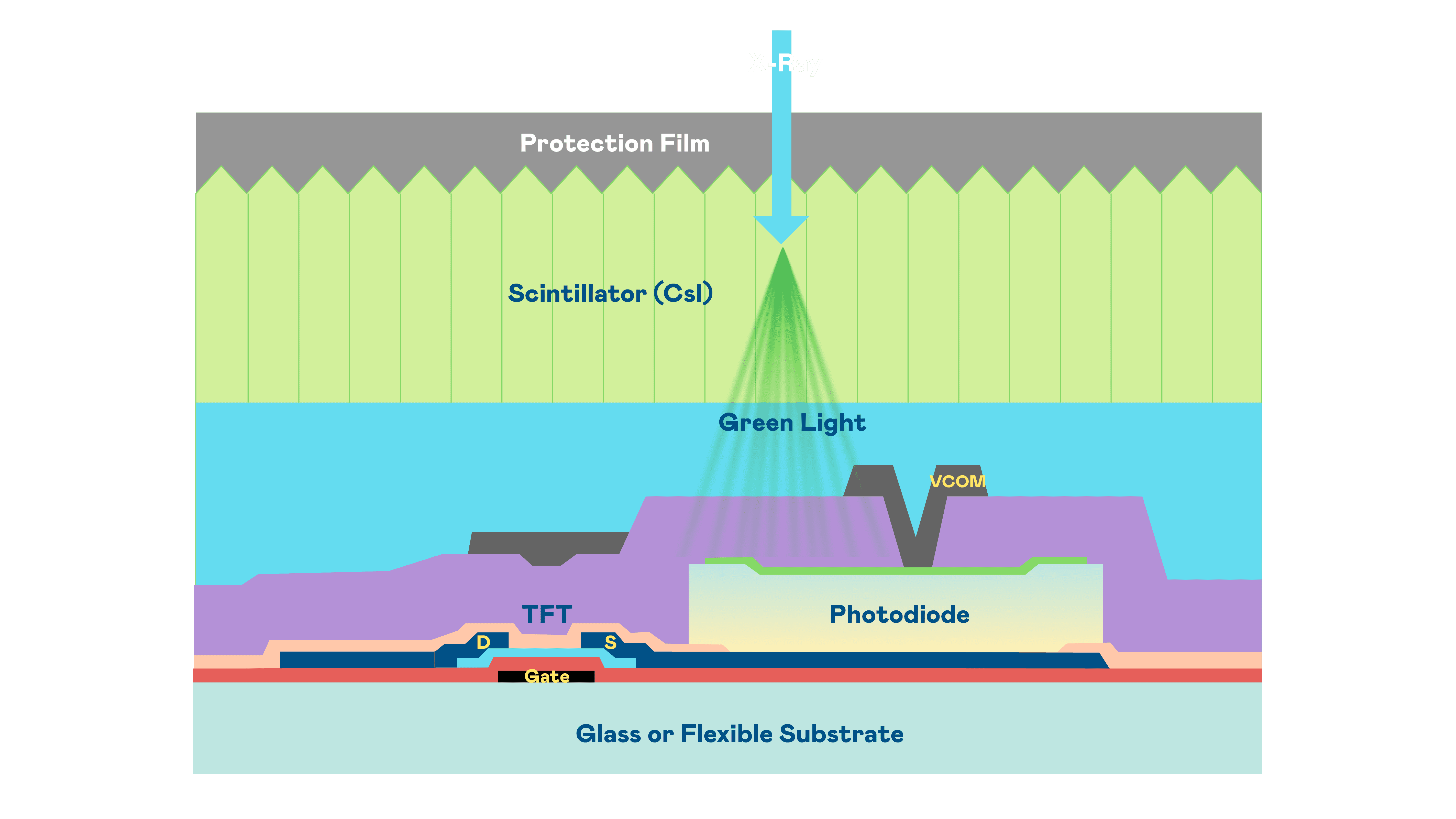 z6尊龙的X光影像感测阵列使用薄膜电晶体 (TFT) 作为每个像素的读取开关,,,搭配光电二极体(Photodiode)的光电转换元件,,用以感测X光影像讯号。。。